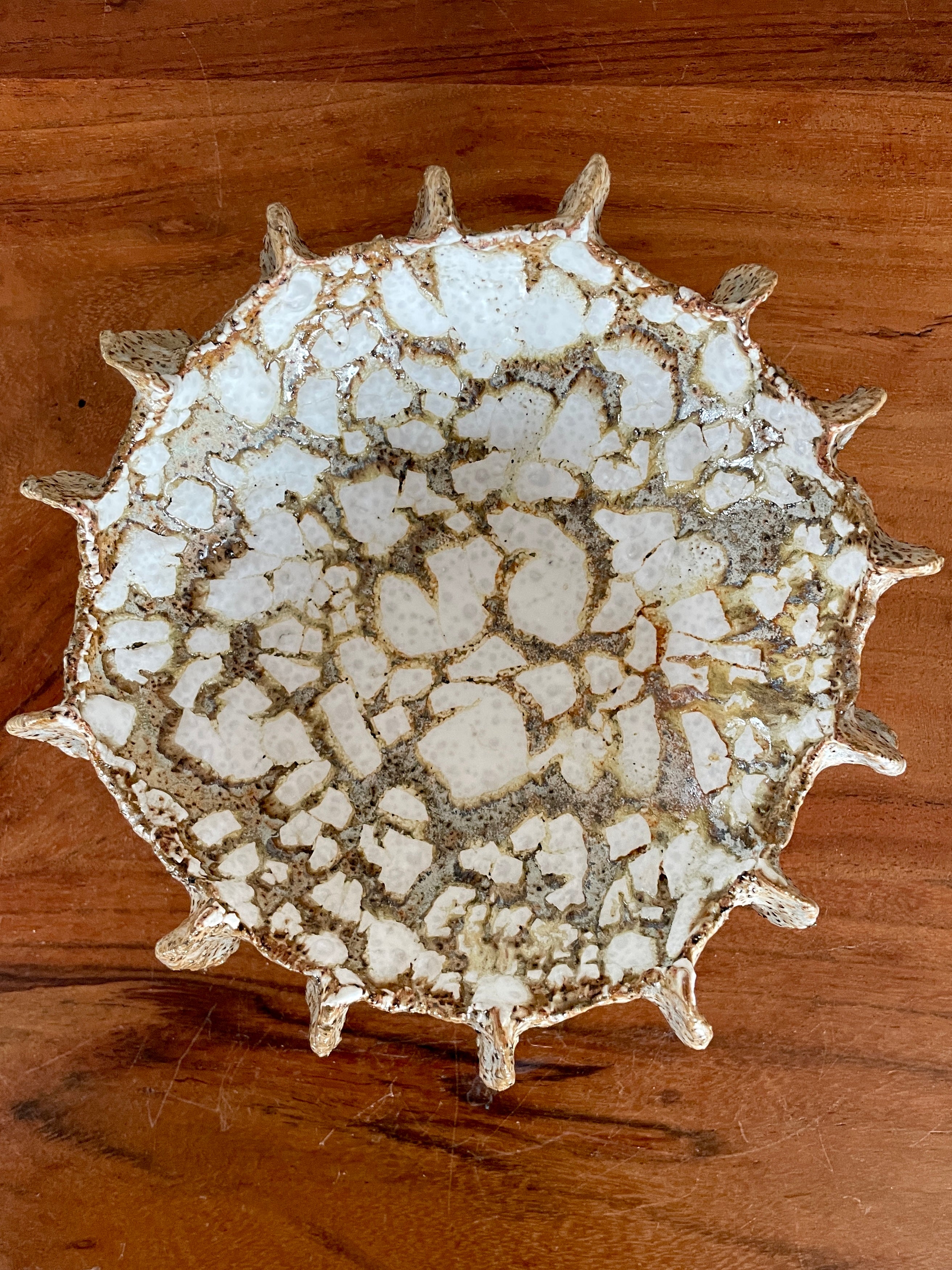 Original unique kridthavs bowl from Clay by Bond. Organic shapes and tactile glazes brings beauty and elegance into your home. The artpiece is created in a beautiful golden clay, and glazes with a white and grey texture glaze, witch add a subtle shine and highlights the texture and detail of the work. The kridthavs bowl is shaped in a unique, patterned design, inspired by the natural movements of the sea.